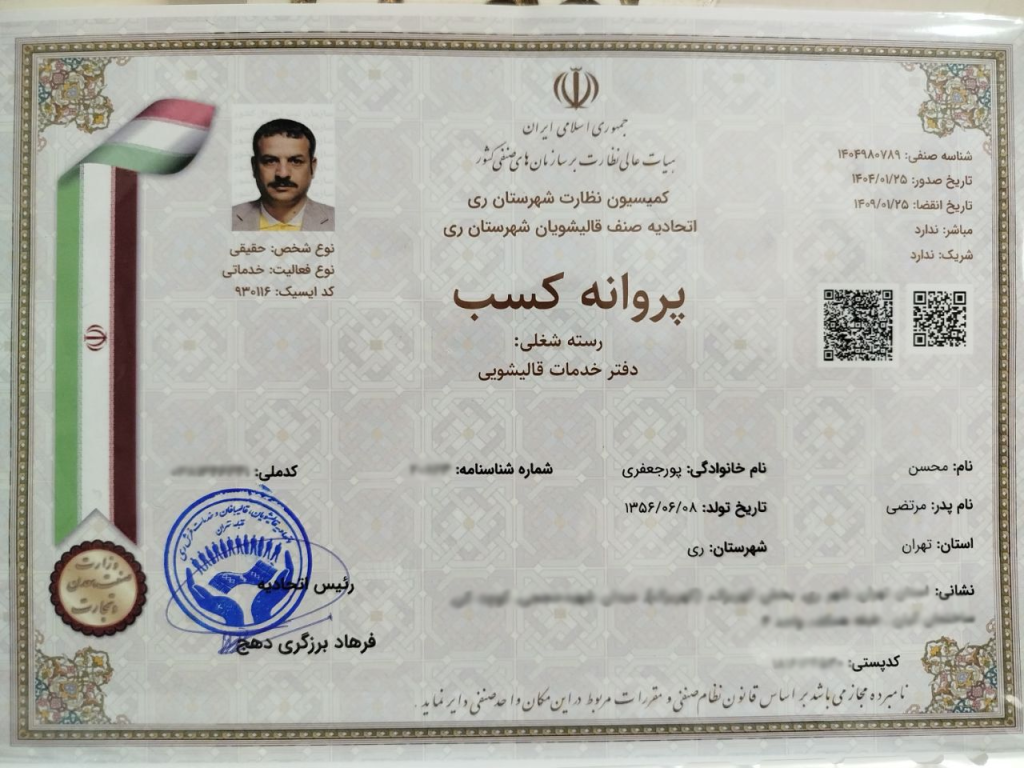 قالیشویی هوم کر با مجوز رسمی فعالیت از اتحادیه قالیشویان تهران، با افتخار خدمات خود را بهصورت قانونی، شفاف و مطابق با استانداردهای صنفی ارائه میدهد.داشتن این مجوز نشاندهنده تعهد ما به کیفیت، رعایت اصول بهداشتی و قیمتگذاری منصفانه است. با اطمینان خاطر فرشهای ارزشمند خود را به ما بسپارید؛ چرا که فعالیت ما زیر نظر مراجع قانونی و با رعایت تمام اصول صنفی صورت میگیرد.